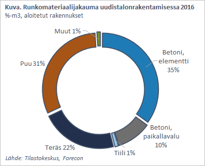 Puun käyttö rakentamisessa kasvaa, mutta markkinaosuus pienentynytPuu menetti uusien talojen runkomateriaaleissa johtoasemansa betonille vuonna 2014. Syy löytyy em. rakennemuutoksesta eli puuvaltaisen omakotirakentamisen voimakkaasta vähenemisestä samaan aikaan, kun betonivaltaisen kerrostalorakentamisen määrä on noussut vastaavasti. Puurunkoisten rakennusten aloitukset kasvoivat viime vuonna reippaasti, 25 prosenttia, kun kokonaisaloituksissa kasvua oli 12 %, mikä merkitsi puun markkinaosuus kasvua. Tämän vuoden tammi-syyskuussa puurakennusten aloitukset kasvaneet vähemmän (+3 %) kuin aloitukset keskimäärin (+ 9 %). Kuluvana vuonna betonin markkinaosuus kaikista uudisrakennuksista on noussut yli 50 prosenttiin ja puurunkoisten pudonnut alle 30 prosenttiin. Käänne on kuitenkin tapahtumassa. Taustat ovat kerrostalorakentamisen vähenemisessä nykyiseltä ylikorkealta tasolta sekä suunnitteilla olevien puukerrostalojen määrä. Puun käyttö (m3) rakentamisessa kääntyi kasvuun vuonna 2016 ja kasvu jatkuu kuluvana vuonna (+4%) sekä ensi vuonna. Puu on edelleen markkinajohtaja niin uusien kuin vanhojen rakennusten julkisivumateriaaleissa, vaikka uudisrakentamisessa rooli on pienentynyt lähinnä omakotirakentamisen vähenemisen takia. Viime vuonna puujulkisivujen osuus uusista julkisivuista laski lähelle 30 prosenttia. Kyse on kuitenkin eräiden suurten hankkeiden aiheuttama teräksen osuuden reipas kasvu.