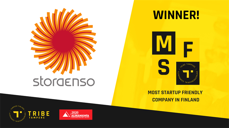 Uusiutuvien materiaalien yhtiö Stora Enso valittiin vuoden 2020 startup-ystävällisimmäksi yritykseksi Suomessa. Yrittäjyys- ja startup-yhteisö Tribe Tampere palkitsi Stora Enson jo toista kertaa ykköspalkinnolla. Stora Enso on viimeisen neljän vuoden aikana käynyt keskusteluja noin 1300 startup-yrityksen kanssa.