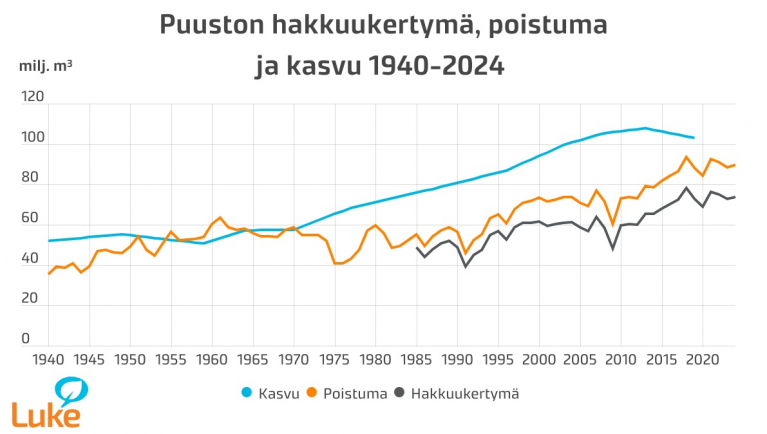 Metsiin jäi hakkuista ja metsänhoitotöistä lähes kahdeksan miljoonaa kuutiometriä runkopuuta sekä saman verran luontaisesti kuollutta runkopuuta. Kun huomioidaan myös hakkuut, niin elävän puuston poistuma oli vuonna 2024 kaikkiaan 89,6 miljoonaa kuutiometriä. Se oli prosentin enemmän kuin vuotta aikaisemmin ja prosentin suurempi kuin edellisen viisivuotisjakson keskiarvo.