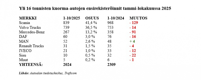 Lokakuun loppuun mennessä raskaita, kokonaismassaltaan yli 16 tonnisia kuorma-autoja on rekisteröity 2024 kappaletta. Laskua viime vuodesta on reilut 12 prosenttia, tuolloin vastaava määrä oli 2309.
