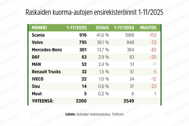Kuorma-autojen ensirekisteröintejä oli tammi-marraskuussa 2 675, eli 17,6 prosenttia vähemmän kuin viime vuoden vastaavana ajankohtana. Raskaiden, eli kokonaismassaltaan yli 16 tonnisten kuorma-autojen osalta muutos on ollut hieman maltillisempi. 13,7 prosenttia. Tämä näkyy kaikilla valmistajilla rekisteröintimäärien laskuna viime vuoteen verrattuna, ainoa poikkeus on MAN, joka on plussalla yhden kuorma-auton verran.