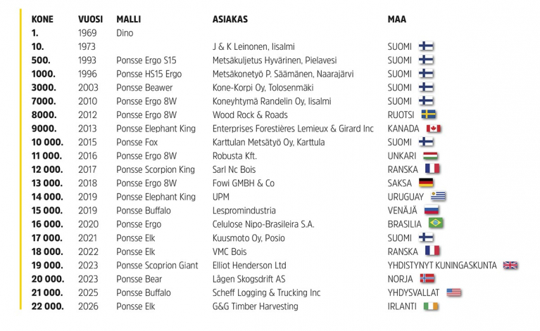 Tasan viikko sitten Ponsse tiedotti uudesta merkkipaalusta, kun 22 000. Vieremän tehtaalla valmistettu metsäkone luovutettiin asiakkaalle, tällä kertaa Irlantiin. Kaltaiselleni tilastonörtille Ponssen uutiset merkkipaalukoneiden luovutuksista tarjoavat aina herkullisen mahdollisuuden myös katsastaa miten Vieremän tehtaalla kulkee ja kuinka sen tuotteet käyvät kaupaksi globaaleilla metsäkonemarkkinoilla. Jokainen kone kun tehdään asiakastilauksesta.