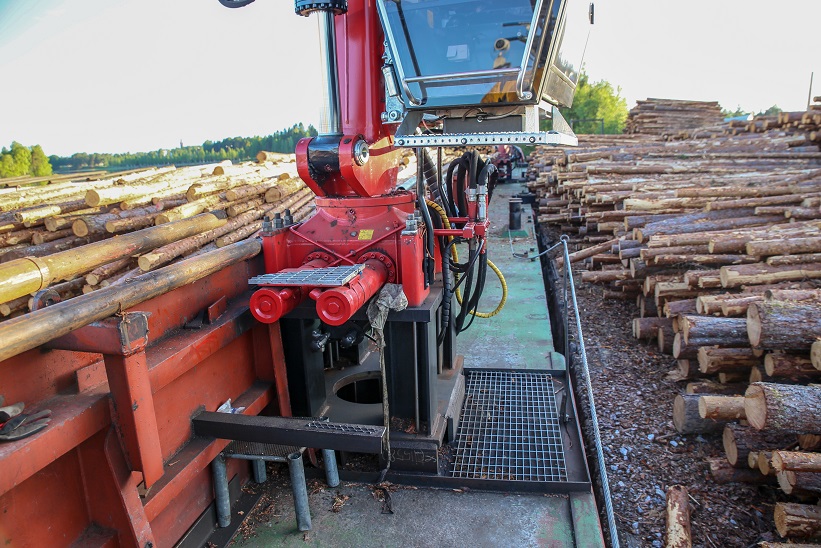 Proomun satamassaoloaika on pyrittävä saamaan mahdollisimman lyhyeksi. Jermacin työntämässä Annuska proomussa on kaksi Jonsered 2990 SR -teollisuuspuutavaranosturia. Järeä, lähes 4600 kiloa painava nosturi on tarkoitettu ainoastaan kiinteästi asennettavaksi. 2990 SR:n nostokyky on 3350 kiloa, joten sillä nousee raskaskin puutavara mukisematta kyytiin. Ulottuvuutta nostureilla on peräti 16 metriä, joten puupinoja saa olla rannassa kaksi rinnakkain. Järeydestään huolimatta nosturi on yhtä ketterä ja käteen käyvä, kuin muutkin Jonseredin puutavaranosturit.