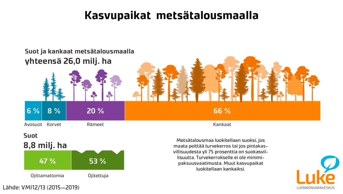 Metsätalousmaasta kolmasosa on soita ja loput kankaita. Metsätalousmaan nykyisestä suoalasta reilu puolet on ojitettu. Pienin soiden osuus on Ahvenanmaalla, jossa 92 prosenttia metsätalousmaan kasvupaikoista on kankaita. Manner-Suomessa soiden osuus metsätalousmaasta on pienin Päijät-Hämeessä ja Uudellamaalla, joissa kummassakin soiden osuus jää reiluun kymmenykseen metsätalousmaan pinta-alasta. Suurimmat osuudet ovat Pohjois-Pohjanmaalla, Keski-Pohjanmaalla ja Etelä-Pohjanmaalla. Näissä soiden osuus metsätalousmaan alasta vaihtelee 53 ja 44 prosentin välillä.